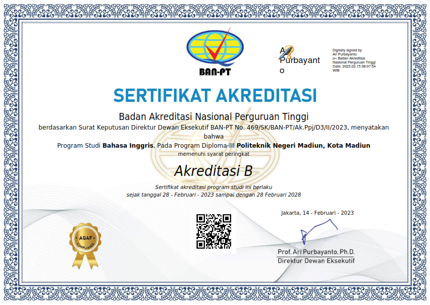 Program Studi DIII Bahasa Inggris memiliki status akreditasi “B”. Status ini merupakan capaian yang memuaskan mengingat Program Studi DIII Bahasa Inggris tergolong prodi baru.